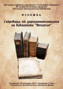 Днес в Ректората на СУ се открива изложба „Съкровища от дарохранителницата на Богословската библиотека“, съобщи БГНЕС. Тя е по повод 125-годишнината на СУ „Св. Климент Охридски“ и Университетската библиотека и 90-годишната история на Богословски факултет.